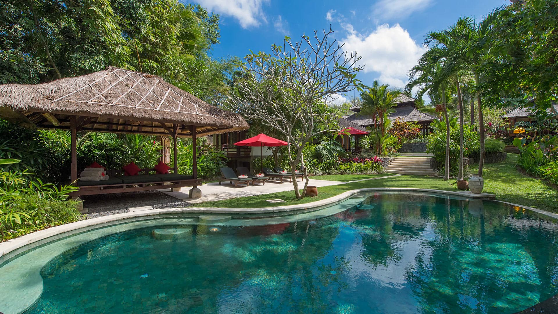 Stepping stones link terraced gardens and pavilions at this secluded villa whose name means singing river pangi. peruse the library, try a little ping pong, and escape to the poolside balé nestled into the edge of a tropical forest.
